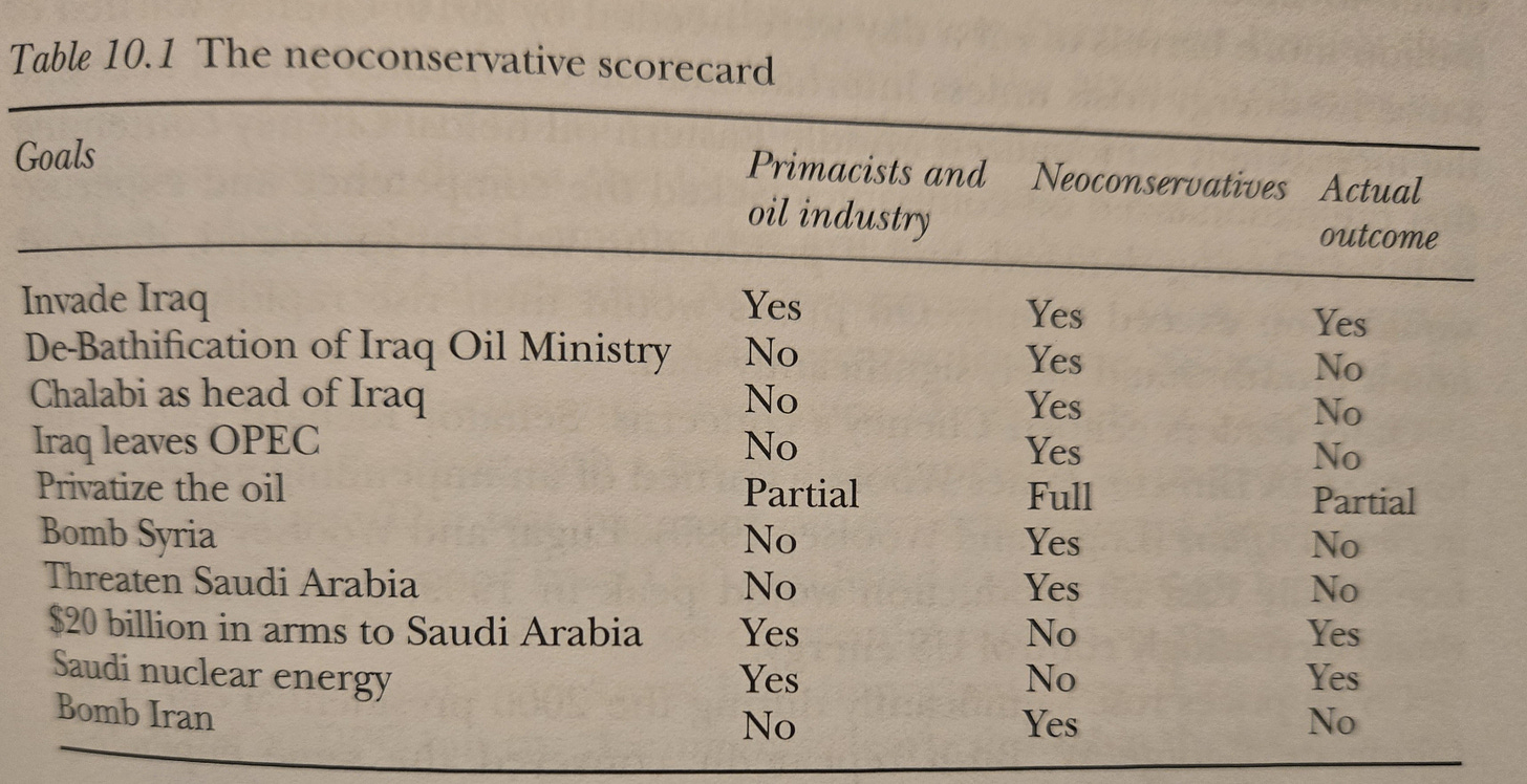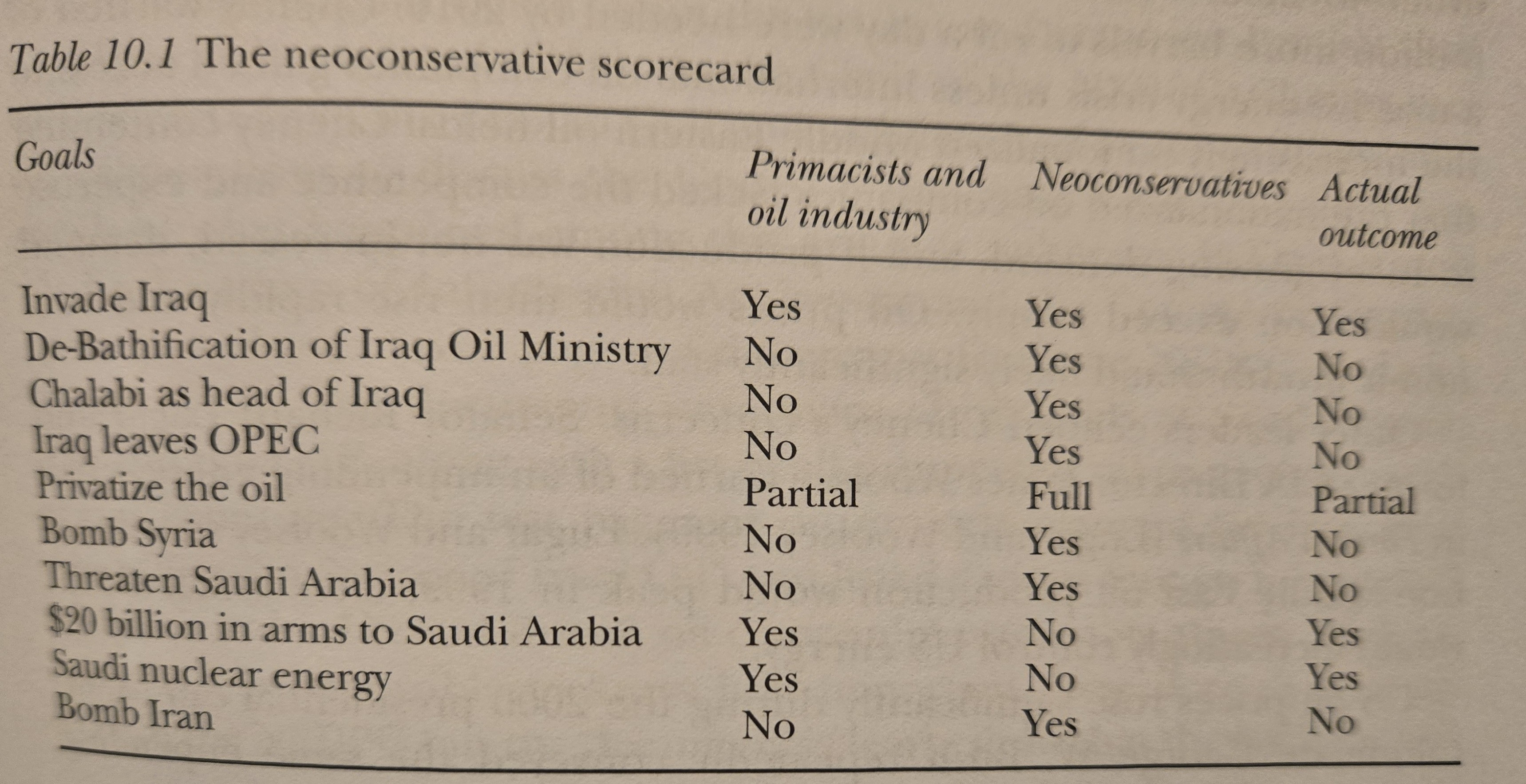 Proponents of war for Israel/Neocon theory also suggest that Neocons basically had free reign in the administration and that everything was just at their behest including taking a whole nation to war. This is not what the record shows. Everything from the timing of the war, the army mobilization, and post-war planning were certainly not just given over to the Neocons. I’ve already discussed CIA/State Department dismissal of Neocon talking points on AQ and Powell’s refusal to use those talking points in his UN speech. Robert Draper dismisses the idea that Paul Wolfowitz was somehow the “architect” of the war.28 Wolfowitz urged to go after Saddam right after 9/11 using his “enclave strategy” (not really his strategy, but more General Wayne Downing which was somewhat similar to the plan for the Anabasis project in which the CIA led by John Maguire were to infiltrate Iraq and topple Saddam following failed coup attempts in the 90s).29 Bush did not follow Wolfowitz lead and instead opted for a later time to deal with Saddam specifically stating “we will get this guy but at a time and place of our choosing”.30 The enclave plan was also more or less shut down right away being seen as not realistic as well as the idea of forming a provisional government in exile led by Chalabi. Both CENTCOM and the State Department disagreed with these policies and so they did not happen.31 aides to Doug Feith were also shut out of the CENTCOM planning team after they annoyed the CENTCOM officials too much with their insistence on lowering troop levels, something that Rumsfeld had been advocating for.32 It seems that if anything alot of the Neocons were just seen as a nuisance with General Tommy Franks calling Feith “the stupidest fucking guy on the planet”. Regardless of their personal opinions of the Neocons here is a good chart from Cramer and Duggan’s article “In Pursuit of Primacy” in the Collection Why did the United States Invade Iraq? page 225 (ed. by Cramer and Thrall).