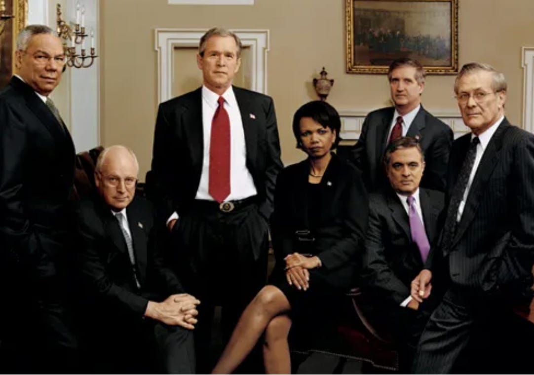 First, let’s point to the obvious; none of the top administration officials were Jewish and/or neocons. Both Cheney and Rumsfeld, having worked with some of the J Neocons in the past, were in fact the ones who hired them on to work in the Bush administration having known their positions on Iraq and broader foreign policy from working with them previously (Cheney and Wolfowitz worked together in the Bush sr. administration, Rumsfeld and Wolfowitz working in the Reagan administration together, all being involved in PNAC, etc). Cheney especially was prominent in this decision making process.1 This just to say that these men knew who they were bringing on to the administration and were not duped in any way which leads us to Bush. Bush, while being a bit naive, was not some totally aloof person either and at the very least had a personal beef with Saddam along with viewing Iraq as a top priority for his new administration in talks with Clinton during the transitionary meeting between the two presidents.2 Powell, oftentimes seen as a dove, was not so, but just more into unilateralism and getting the international community involved, but in principle not against war.3 Rice, while not playing a huge role also was not avoidant of war and largely followed the lead of the President and advocated the pre-emptive war strategy in her office’s National Security Strategy paper.4